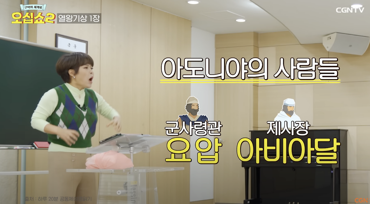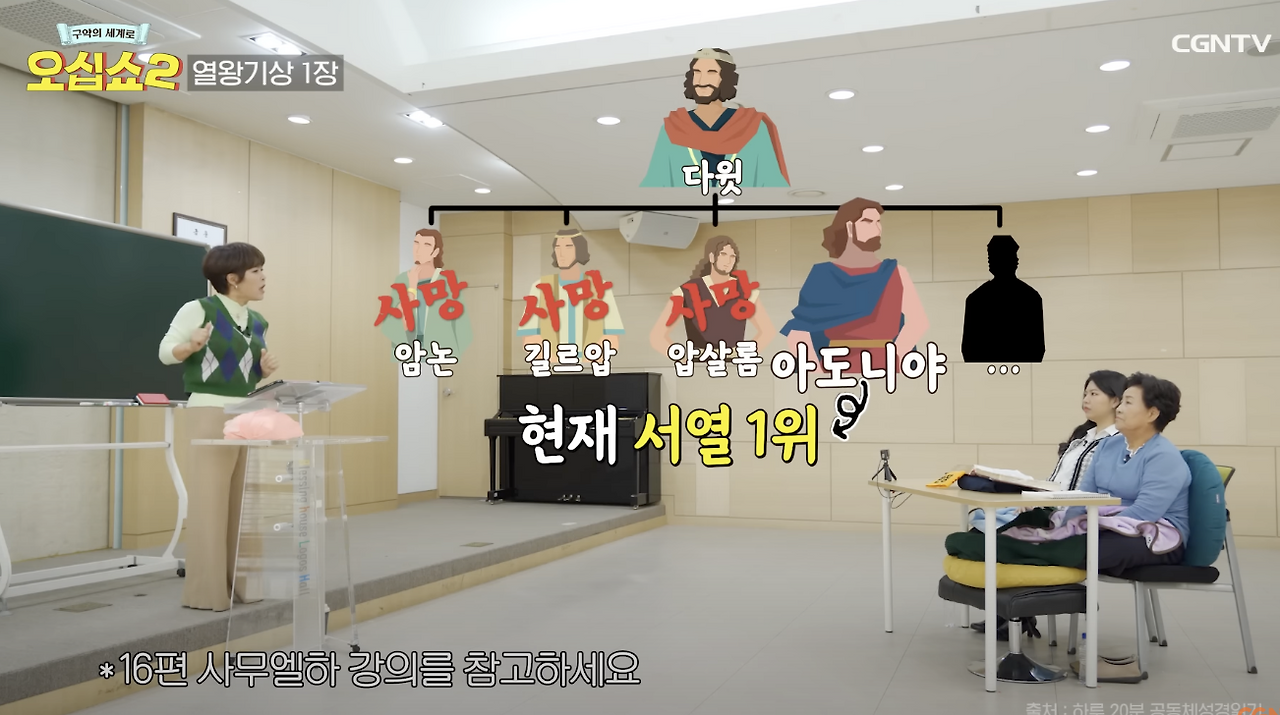 1장: 다윗의 아들 아도니야가 다윗왕이 쇠약해지자 스스로 왕이 되겠다고 나서면서 세력을 키운다.