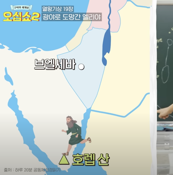 브엘세바에서 하나님이 준비한 음식을 먹고 설득을 당한 엘리야가 스스로 호렙산까지 걸어간다. 광야로 도망간 엘리야. 동굴속에있는 엘리야. 패배의식에 휩싸인 엘리야. 사르밧 과부 아들 살리고, 바알선지자 죽인것을 보여줬는데도 낙담한 엘리야에게 하나님이 "나와봐라"하고 보여주신다. 강한 바람과 지진 불을 보여주시는 하나님. "엘리야가 니가 여기 왜 있느냐" 또 물어보신 하나님. 그러나 또 두려워하는 엘리야. 엘리야 선지자에게도 나타나는 약한모습.