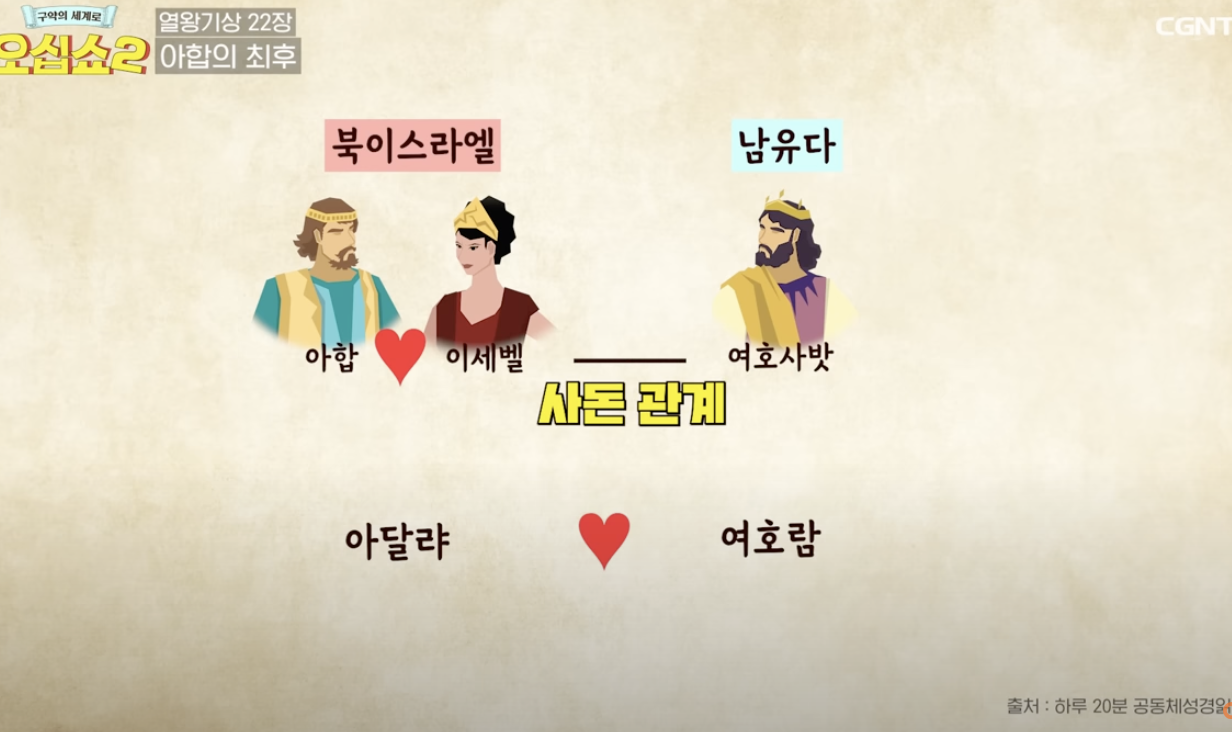여호사밧 아들 여호람과, 아합+이세벨의 딸 아달랴가 결혼하여 우호적인 관계에 있는 북이스라엘과 남유다.