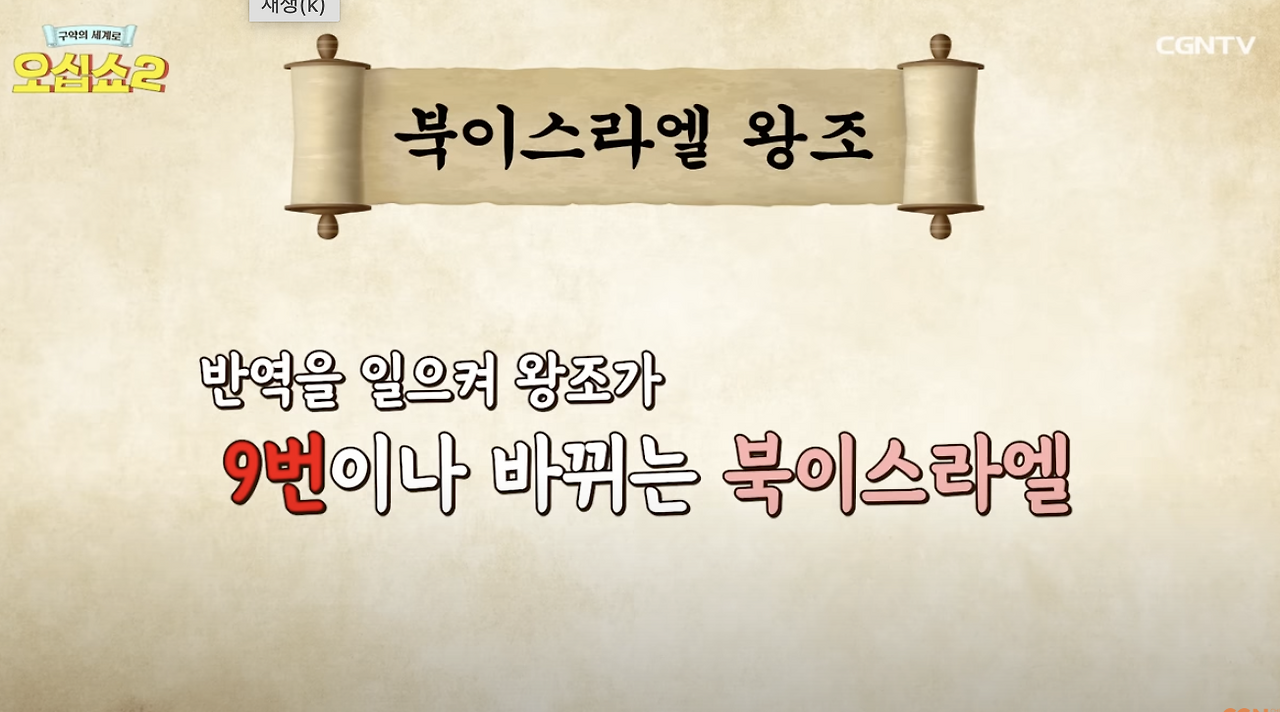 북이스라엘 왕조는 여로보암>나답> 쿠데타를 일으켜서 나답을 죽이고 왕이 된 바아사>엘라> 엘라를 죽인 시므리, 시므리가 왕이된지 7일째 사람들이 오므리를 세웠다, 이에 시므리가 자살한다> 이후 한동안 이어지는 오므리 왕조! 오므리왕 시절 이때 처음으로 북이스라엘 수도를 사마리아로 옮겼다 (원래 북이스라엘 수도는 세겜) 특별한 기록은 없지만 오므리 왕 아합이 본격적으로 악행을 저지른다. 선지자 엘리야의 이야기가 part 3에서 이어진다.