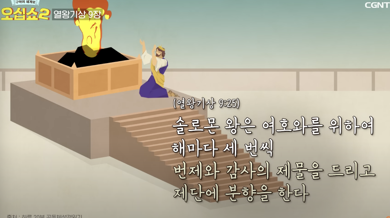 9장: 솔로몬 왕은 여호와를 위해 해마다 세번씩 번제와 감사제목으로 제단에 분향을 한다.
