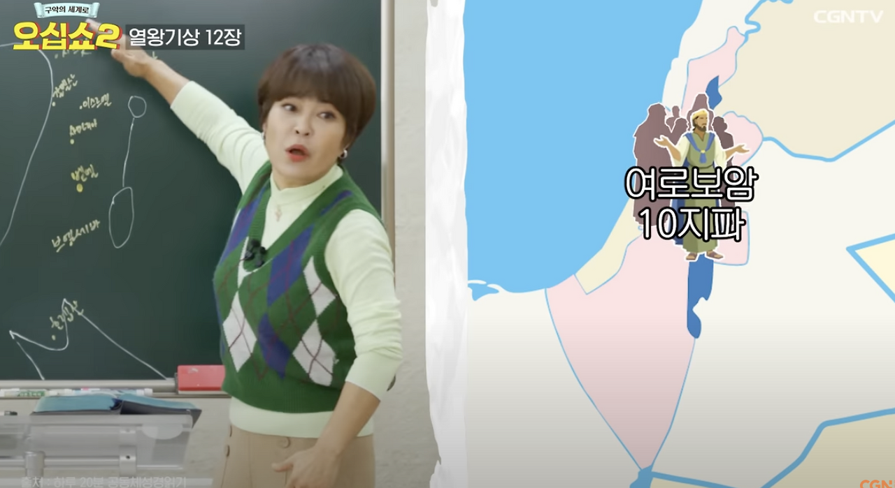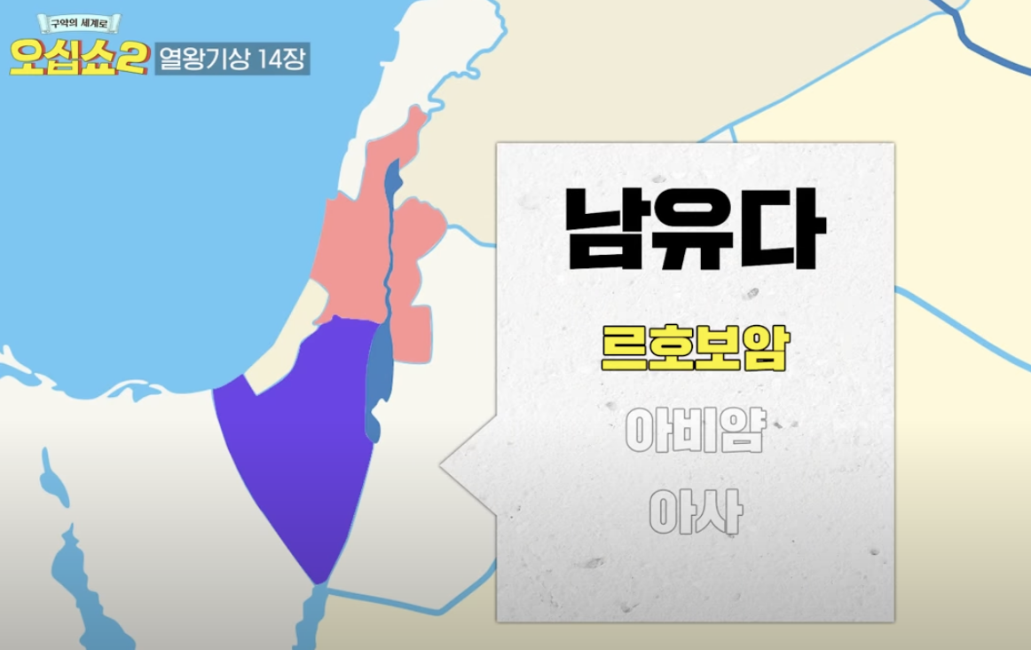 르호보암은 젊은 신하들 의견을 채택하여 "우리 아버지는 채찍으로 세금내라고 했다면 나는 전갈 채찍으로 할것이다"라고 말한다. 이에 다윗왕조에서 등을 돌린 백성들 열지파가, 이른바 '여로보암 10지파'와 위로 올라간다. 북으로!