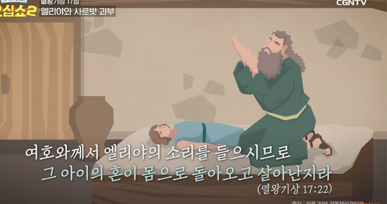 17장 하나님이 엘리야 (나의 하나님은 여호와시다, 라는 뜻)에게 아합을 찾아가 '수년간 비가 오지 않을것이다'라고 예언하라고 말씀하심. 그릿 시냇가에 머문 엘리야에게 떡과 고기를 가져다주는 까마귀! 시돈땅 사르밧에 살고있는 과부에게 먹을 것을 달라고해서 생활을 하라고 안내해주신 하나님.
