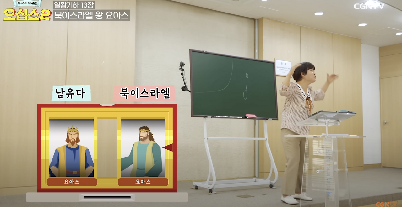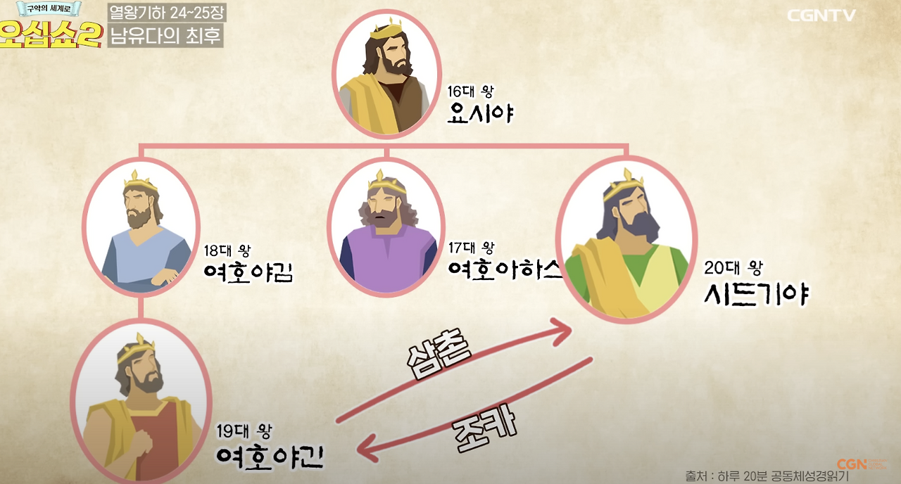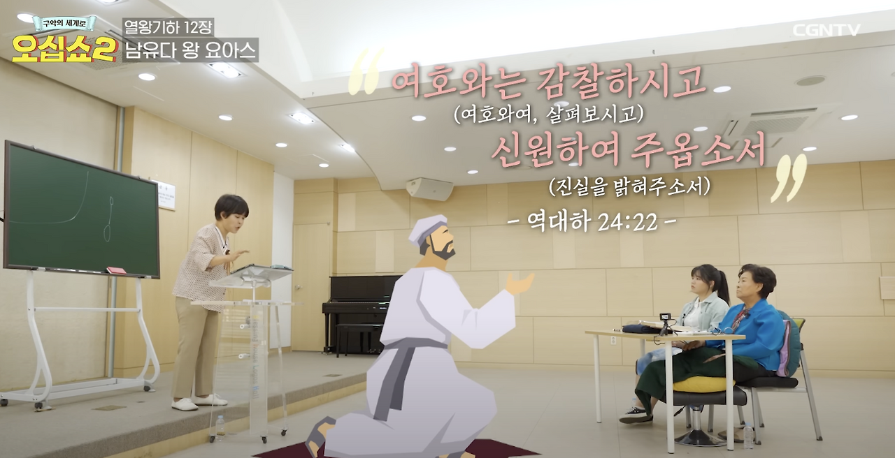 아달랴가 신경안쓴 성전을 수리하자는 요아스 (7세)말에도 23년간 수리가 되지 않는다. 화가난 요아스가 레위지파와 여호야다가 따로 괘를 만들어 '성전고치는데 쓰는 헌금함'을 만들어 성전을 수리하는 좋은 왕이 되었다. 스승 여호야다가 죽자 아세라상을 섬긴 요아스. (복장터지는 조혜련 집사!!) 제사장 여호야다의 아들 스가랴가 경고한다. 제사장 스가랴를 돌로 쳐 죽인 요아스왕.