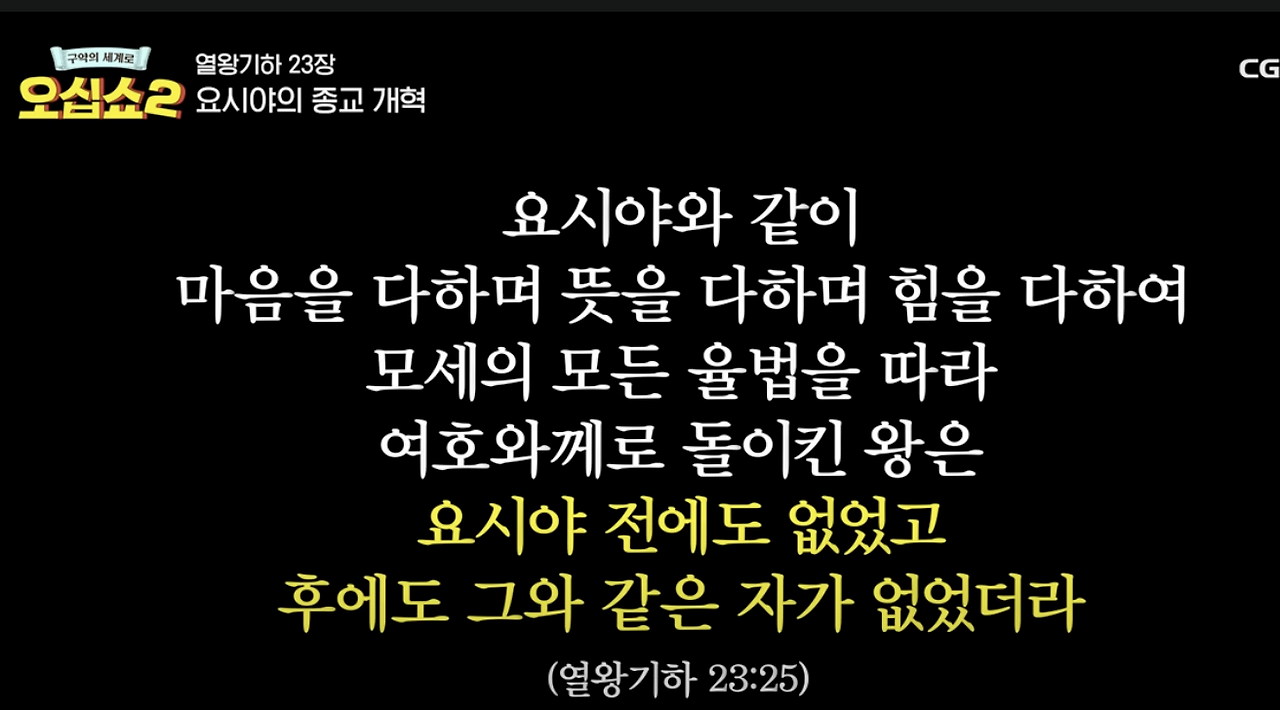 성전을 보수하기 시작한 요시야. 대제시장 힐기야가 성전보수중에 율법책을 발견하고 놀라서 요시야 왕에게 읽어준다. 우상섬기고 율법 지키지 않으면 망한다는 부분이 자세하게기록되어 있었다.