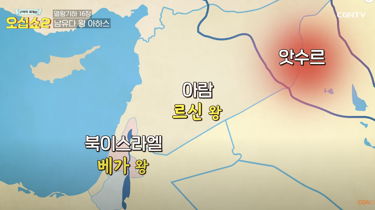 아람, 북이스라엘, 남유다가 힘을합쳐셔 앗수를 치자는 공격. 그런데 남유다가 거절. 불안해진 북이스라엘+아람 연합굼이 앗수르 치기 전에 남유다를 치러 감. 아하스가 이방우상 몰렉을 섬기면서 아들을 바친 최악의 왕. 북이스라엘+아람연합군에 불안해하는 왕에게 하나님이 이사야를 보낸다. "너를 구원해낼테니 하나님에게 구해라"했지만 하나님께 구하지 않는 아하스왕. 결국 앗수르에게 의존하는 아하스왕. 앗수르의 도움으로 적을 멸하고 다메섹에 가게된 아하스가 다메섹 이방 성전을 보고(아람 왕들의 신에게 제사를 지내겠다면서) 그대로 왕이 명령대로 제사장이 리모델링을 한다. 하나님의 거룩한 제단을 자기 입맛대로 바꾸는 아하스 (놋제단을 자기 맘대로 쓰겠다는 아하스).