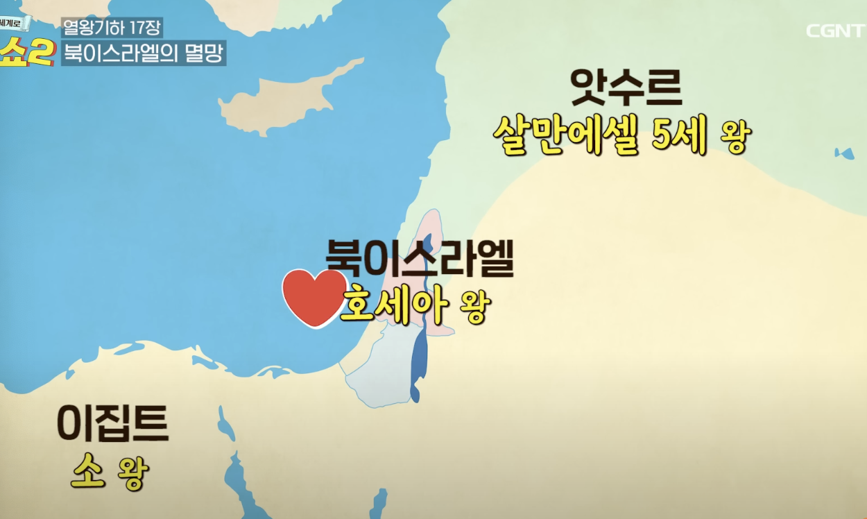 호세아가 앗수르대신 이집트 소왕에게 조공을 바치자 화가난 살만에셀이 3년간 사마리아성(북이스라엘 수도) 에워싸고 괴롭히기 시작. Bc 722년에 마침내 앗수르에 의해 북이스라엘이 멸망한다.