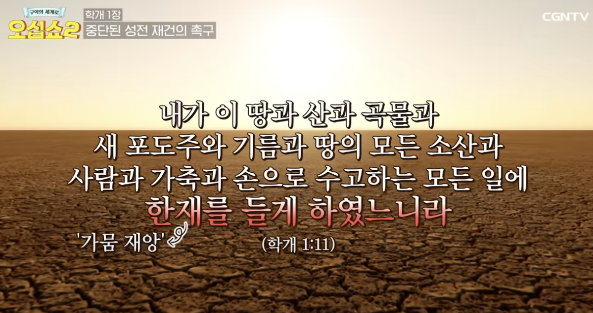 여호와 성전은 중단됐는데 각자가 성전은 뒷전으로 하고 판벽한집(잘 꾸며진집)에 집중하는 백성을 꾸짖는다. 하나님을 내 중심에 둔다고 하면서 정작 그것에는 관심없고 각자 자기집 짓는일에 열중하는 백성들. 다행히 학개의 말을 귀담아 듬는 백성들. 그렇게 다시 시작된 성전건축. 다리오 왕 제 2년. 약 15년만에 재건된다.