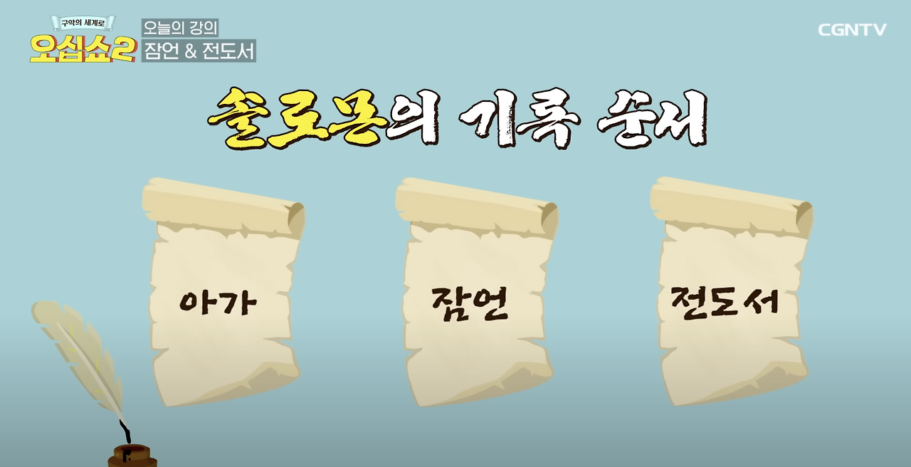 솔로몬의 지혜서라는 별칭이 있는 잠언과, 솔로몬이 노년에 기록한 전도서, 청년의 때 집필한 것으로 알려진, 아가서까지 한번에 정리했다. 성경가이드 조혜련 집사의 <오십쇼>를 보면서.