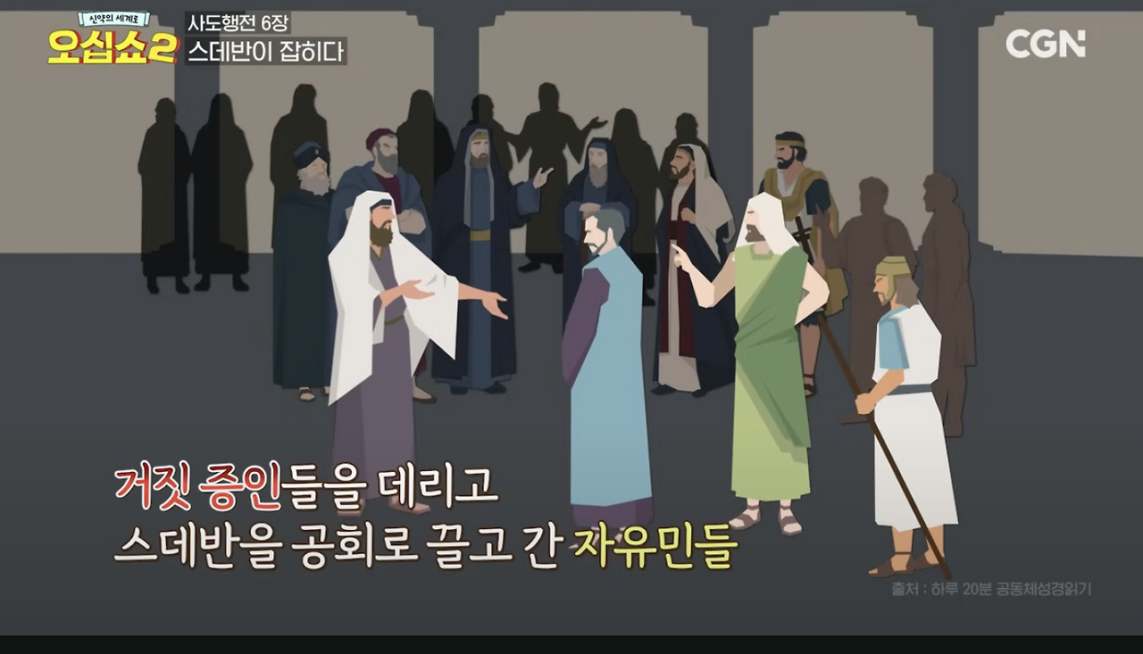 말로 스데반을 이기지 못하자 스데반이 모세와 하나님을 모욕했다고 거짓증언하게 됨. 2명이상 증인이 고발해서 산헤드린 공회에 회부된다.