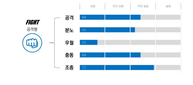 * 공격: 상황을 적극적으로 이끌고 주도하면서 영향력을 발휘하기도 하지만 긴장을 조성하기도 한다.