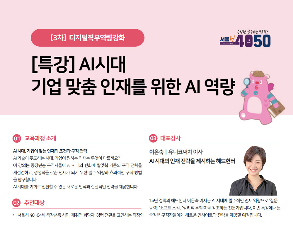 다만 최근에 서울시 50플러스 서부캠퍼스에서 진행했던 <재취업 강의>에서는 85점이라는 다소 낮은 강의평가를 받았다. 강의 내용에는 만족하셨다는 내용이었는데, 운명방식이 조금 아쉬웠다는 의견을 받았다. 줌으로 연결하는 과정에서 GPT로 시연하는 과정에서 로그아웃이 되기도 했고, 네트워크 환경이 좋지 않아 소리가 끊겨 들리고, 마이크 상태도 전반적으로 좋지 않았다고 했다.