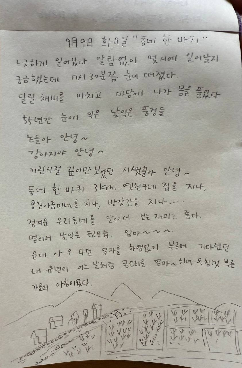 동네 한 바퀴 3km 옛친구네 집을 지나 철아줌마네를 지나, 방앗간을 지나 정겨운 우리 동네를 달려서 보는 재미도 좋다. 멀리서 낯익은 뒷모습!