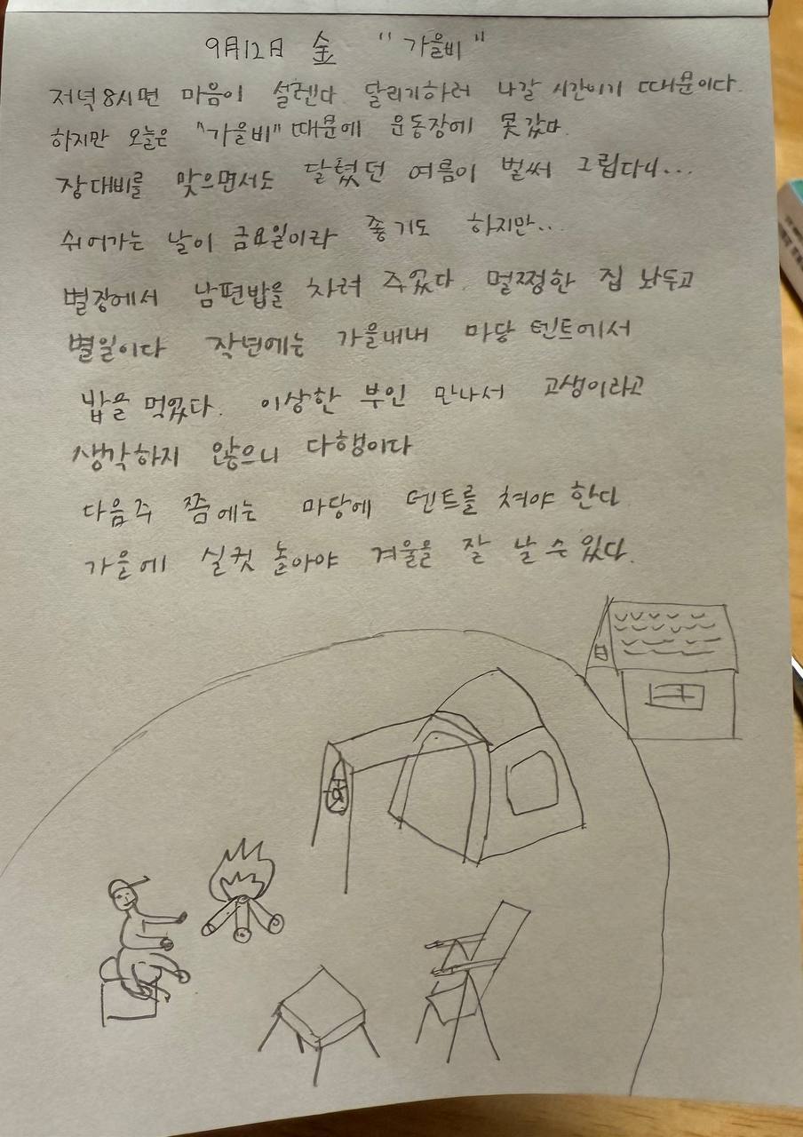 멀쩡한 집 놔두고 별일이다. 작년에는 가을내내 마당 텐트에서 밥을 먹었다. 이상한 부인 만나서 고생이라고 생각하지 않으니 다행이다.