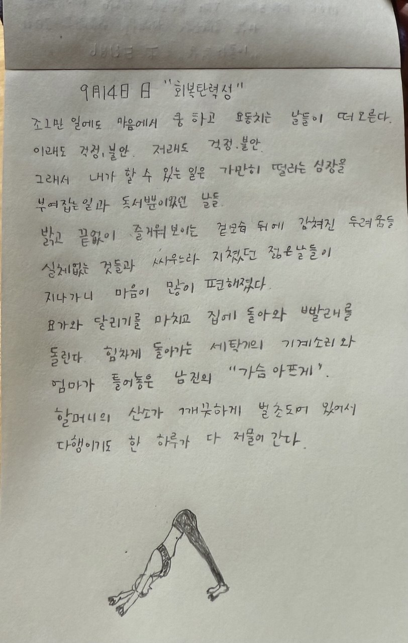 요가와 달리기를 마치고 집에 돌아와 빨래를 돌린다. 힘차게 돌아가는 세탁기의 기계 소리와 엄마가 틀어놓은 남진의 "가슴 아프게". 할머니의 산소가 깨끗하게 벌초되어 있어서 다행이기도 한 하루가 다 저물어 간다.
