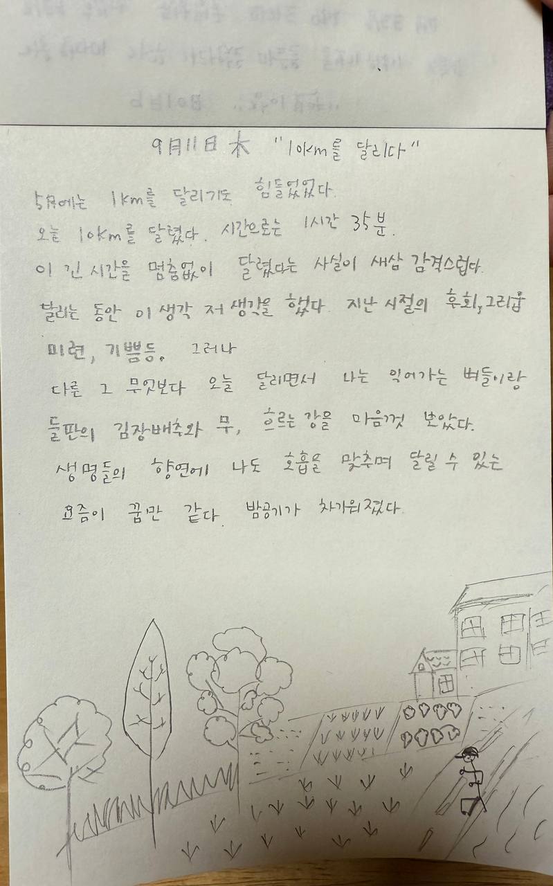 저녁 8시면 마음이 설렌다. 달리기하러 나갈 시간이기 때문이다. 오늘은 "가을비" 때문에 운동장에 못갔다. 장대비를 맞으면서도 달렸던 여름이 벌써 그립다니...쉬어가는 날이 금요일이라 좋기도 하지만...