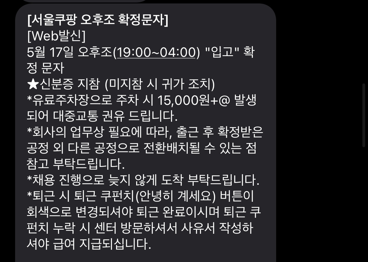 이제 신청의 업무상태가 확정으로 바뀌길 기다려야 한다. 확정으로 넘어가는 단계는 문자 통보가 오는 식이었다. 나는 오후(19시-익일 04시)의 근무를 선택했기에 확정 관련 알람 문자는 근무를 신청 한 당일 오전에 통보가 왔다.