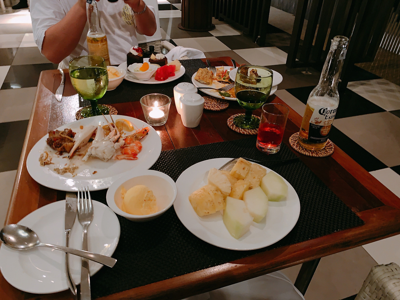 뷔페였기에 먹고 싶은 음식을 원하는 양만큼 담아와 눈으로 먼저 음식을 담았고 그 뒤는 뭐~ 배고픈 사람을 누가 말리리!! 너무 잘 먹는 우리를 보았던 것 인지 셰프의 즉흥 서비스 인지 우리 테이블에 레스토랑의 셰프가 방문했다. 음식은 입에 맞는지, 어디서 왔는지, 혹시 지금 가장 먹고 싶은 음식이 있는지 우리에겐 생선과 소고기 두 종류의 음식을 너희에게 준비해 줄 수 있는데 먹어보겠냐는 질문과 제안의 연속이었다. 너무 좋았고 우린 좋다고 대답하고 싶었지만, 이미 너무나 많이 먹은 상태라 아쉽지만 다음기회에 먹겠다는 말을 전했다. 우리의 대답을 들은 셰프는 정말 아쉬웠다보다. 방번호를 물었고 내일 꼭 다시 와 달라는 말을 남기며 리조트를 방문해줘서 고맙다는 너무나 기분 좋은 환영을 받으며 돌아섰고 그렇게 우리의 특별한 저녁을 마무리했다.