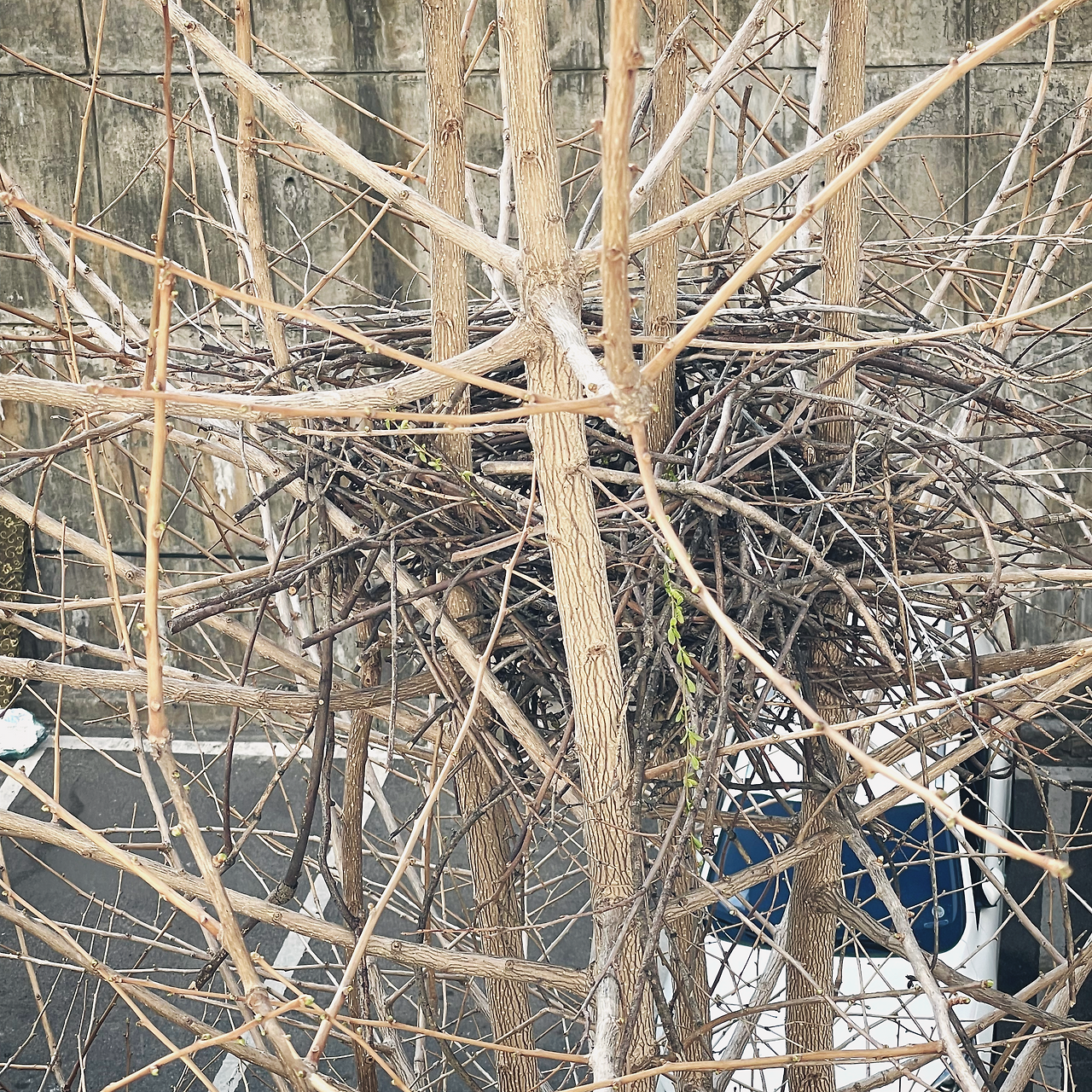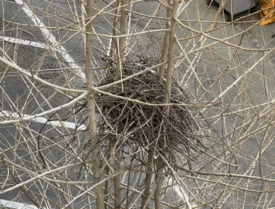 물고 오다 떨어뜨리고, 부리로 자르다가 떨어뜨리고, 그러니 밑에 그렇게 잔가지가 수북할 수밖에...