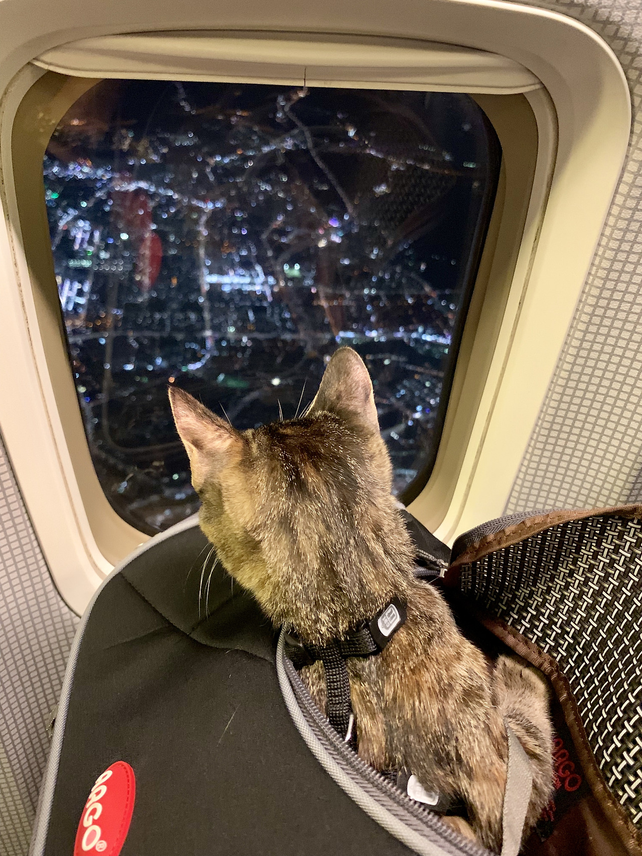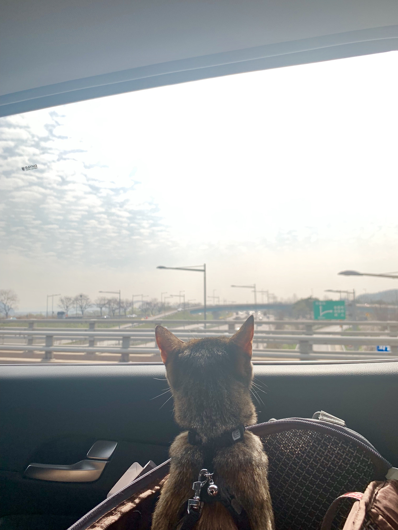 집사는 식은땀을 흘리고 모든 오감이 다 예민해져 있는데 아랑이는 비행기에서 너무 평온하게 창을 구경했다.