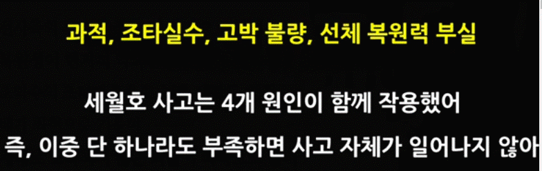 현재 밝혀진 세월호가 침몰한 원인 4가지. 과적, 조타실수, 고박불량, 선체복원력 부실