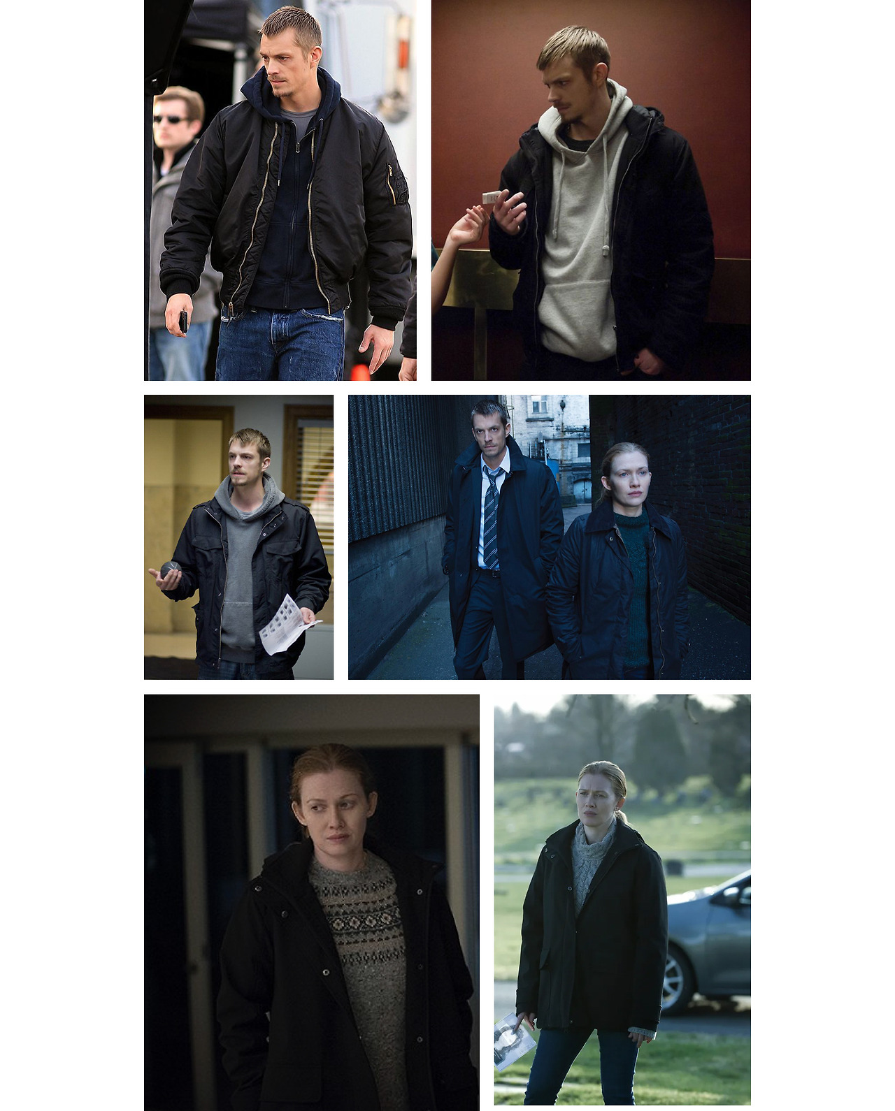 이러한 맥락에서 보면 남주인공인 조엘 킨나만(Joel Kinnaman)의 패션은 예사롭지 않다. 활동하기 편한 진에 대충 걸쳐 입은 후드 재킷과 봄버 재킷이 어리숙한 초입 형사의 매력을 잘 어필함과 동시에 살벌한 현장의 분위기를 제대로 살린다. 여주인공인 미레유 에노스(Mireille Enos)의 패션도 마찬가지다. 시즌 내내 거의 같은 복장으로 등장하는데도 불구하고, 그녀가 착용했던 오버사이즈 스웨터와 바버 재킷의 출처를 묻는 트윗이 정말 많았었다고. 얼핏 보면 다 똑같은 옷 같지만… 잘 살펴보면 모두 다른 게 킬포다.