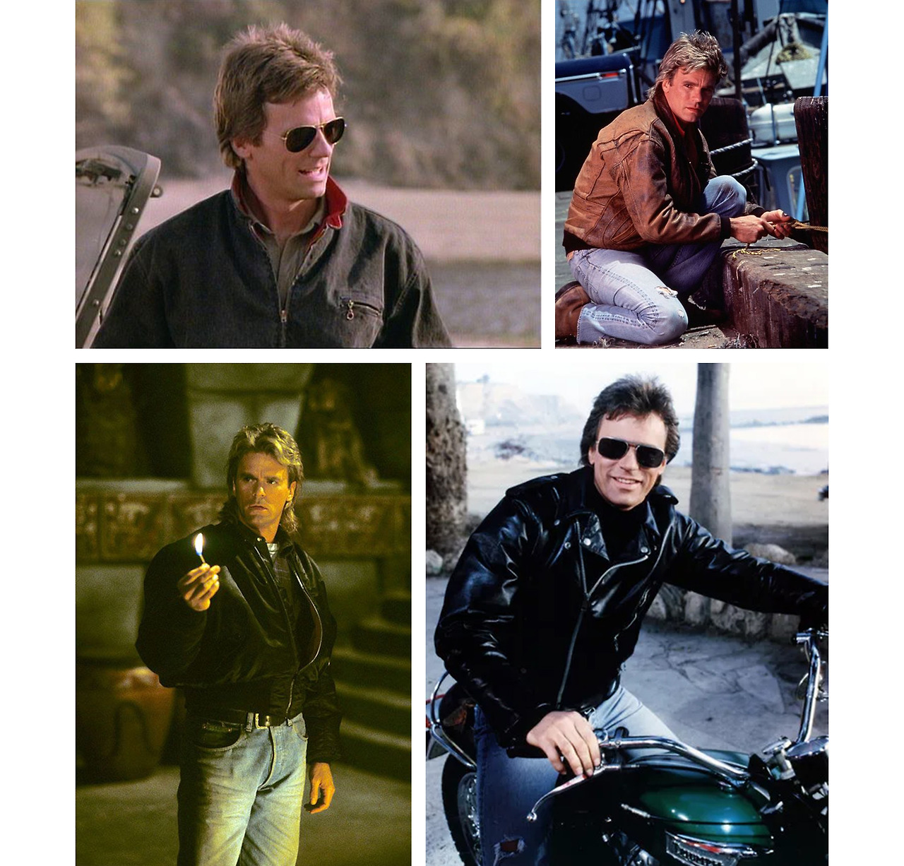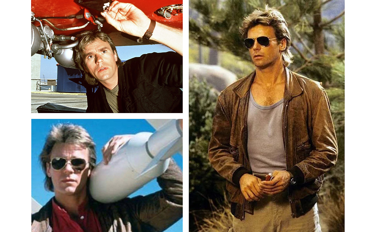 무궁무진한 능력만큼이나 인상 깊었던 그의 패션은 한 시대를 풍미했다 해도 과언이 아니다. 종방한 지 거의 20년이 지난 현재까지도 ’맥가이버 머리’란 명칭이 통용되는 걸 보면 말이다. 또한 그가 착용했던 보잉 선글라스와 레더 재킷, 진의 삼합은 패션계의 필살기나 다름없는 조합으로 진취적인 남성미를 원하는 이들에게 여전히 사랑받는 아웃핏.