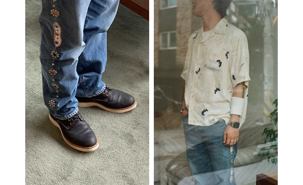 전지훈: 젠테에서 구매한 VISVIM 셔츠. 주호가 동일한 디자인의 검은색 버전이 있는데, 그게 너무 예뻐 보이더라고요. 계속 찾다가 젠테에서 좋은 가격에 득템했습니다! 바지는 KAPITAL, 부츠도 VISVIM입니다.