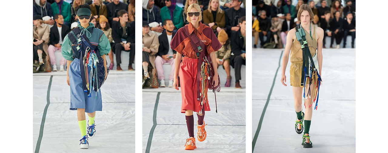 주렁주렁 가방에 메단 카라비너가 돋보이는 Lacoste 2022 SS 컬렉션, 그 어떤 암벽 위에서도 장비 걱정은 없을 듯한 넉넉함을 보여 준다.