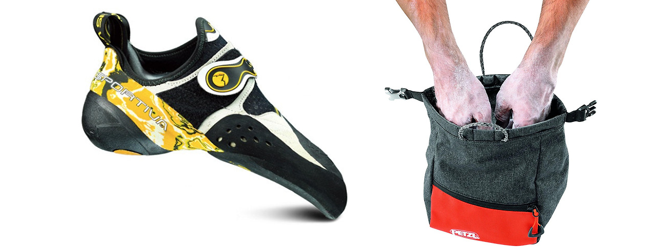암벽화는 가장 기본적인 장비다, 초크 가방 (암벽을 오를 때 손에 땀이 나면 바위나 홀드를 잡기 어렵기 때문에 마찰을 높이는 데 도움을 주는 초크를 담는 용도로 사용된다.)