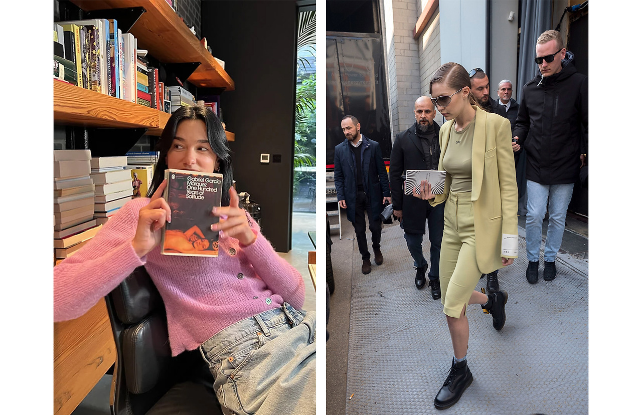 본인의 플랫폼 ‘Service95’에서 매달 북클럽을 운영하고 있는 독서 애호가 두아 리파(Dua Lipa), 까뮈의 <이방인>을 들고 있는 지지 하디드(Gigi Hadid)