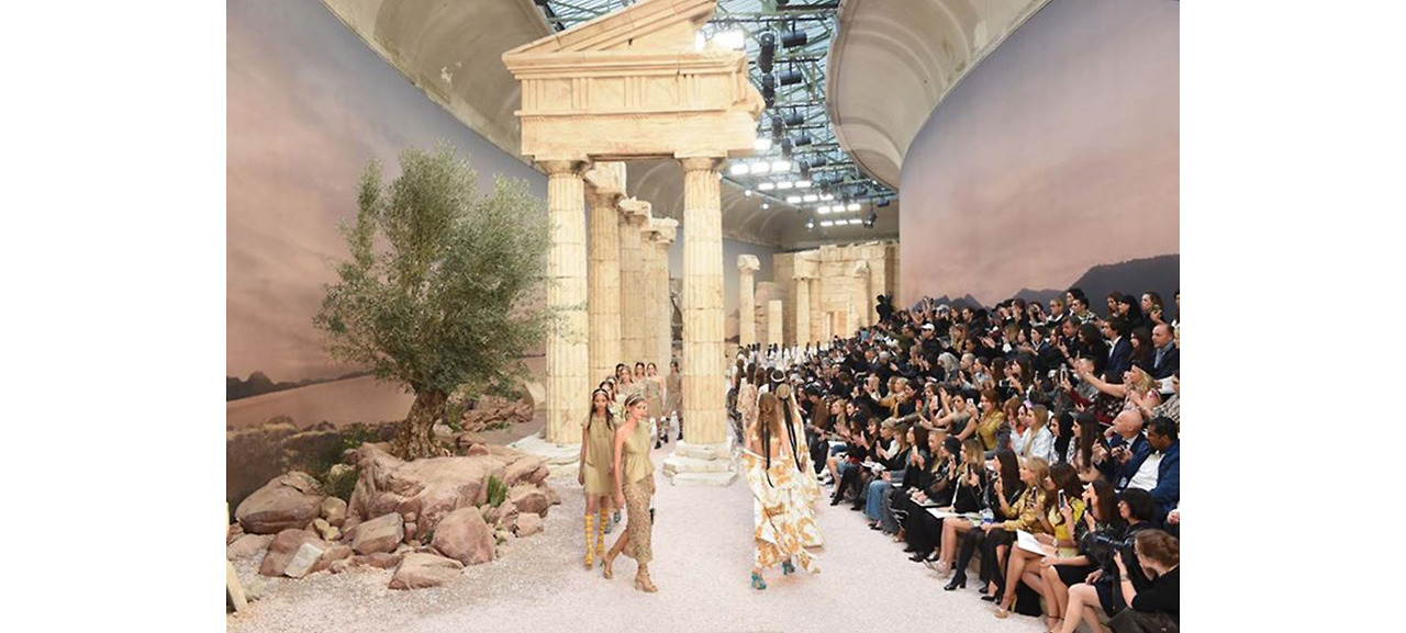 ‘The Modernity of Antiquity’란 제목으로 개최된 CHANEL의 2018년 크루즈 쇼는 고대 그리스의 유적을 세트로 그대로 재현해 관객의 호기심을 증폭시켰다. 드레이핑, 원숄더 실루엣, 골드 액세서리들로 꾸며진 컬렉션 의상은 우리에게 익숙한 그리스 여신의 모습을 떠올리게 만들었다. 특히 각 착장마다 매칭한 글래디에이터 샌들은 당시의 분위기를 잘 반영함과 동시에 강인한 이미지까지 부각할 수 있는 매력적인 아이템이었다.