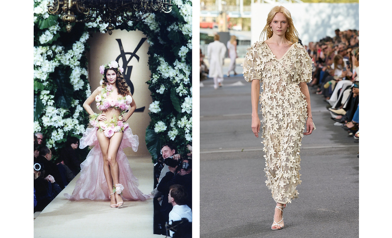 이런 아프로디테에게 영감을 받은 룩이 SAINT LAURENT의 1999년 쿠튀르에 등장한다. 꽃을 유독 좋아했던 그녀와 너무나도 잘 맞아떨어지는 핑크빛 의상이다. 또한 전신의 플라워 장식이 돋보이는 Chloé의 드레스도 굉장히 만족스러워할 것 같다.
