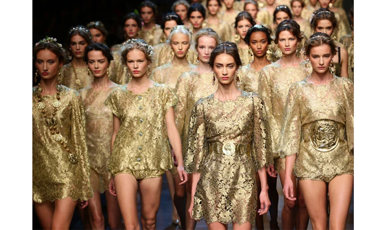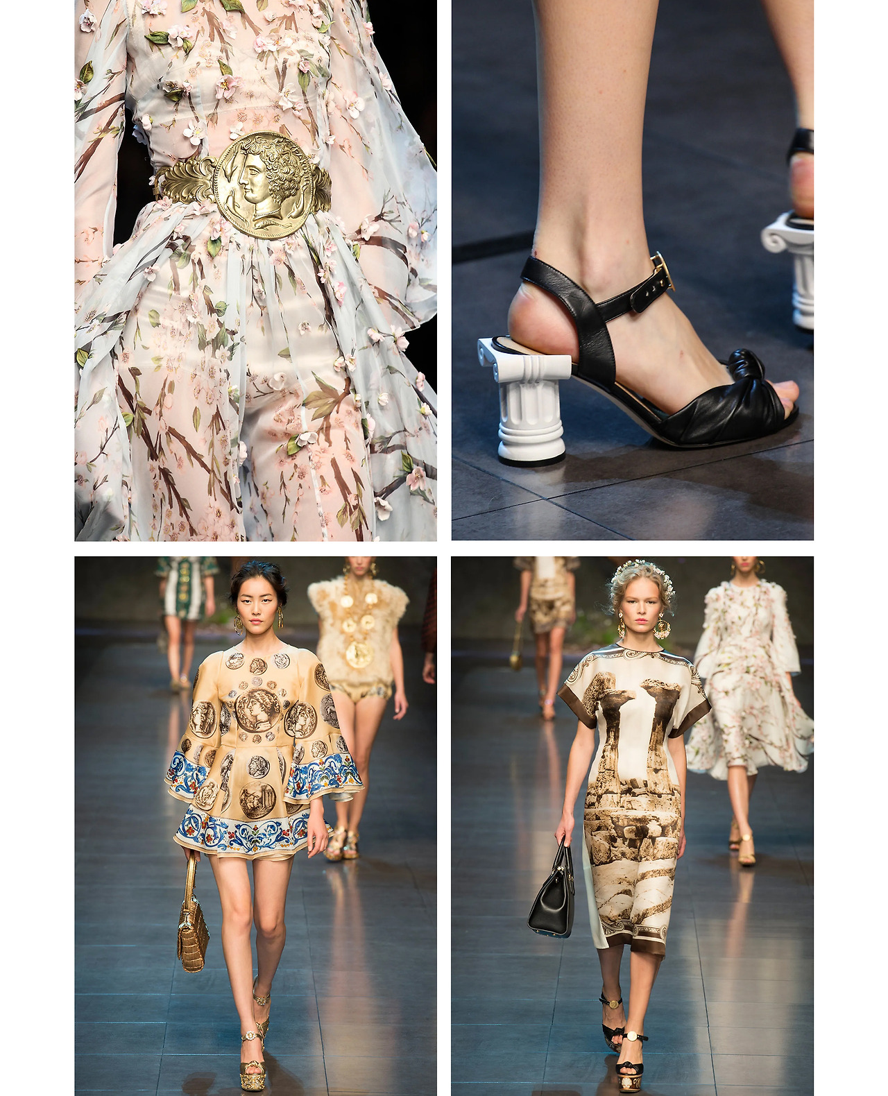 고대 로마의 향취를 가득 머금고 있는 Dolce & Gabbana의 2014 SS 컬렉션. 현재는 폐허가 된 원형 극장의 옛 사진을 프린트하여 의상을 제작한 것은 물론, 고대 건축 양식을 대표하는 이오니아식 기둥을 구두의 굽으로 둔갑시켜 현대 패션에 적용시키려는 노력이 엿보였다. 피날레엔 쇼에 참여한 모든 모델들이 금빛 찬란한 착장을 하고 행진하는데, 마치 올림푸스 신전의 축제를 감상하는 듯한 착각이 들 정도.