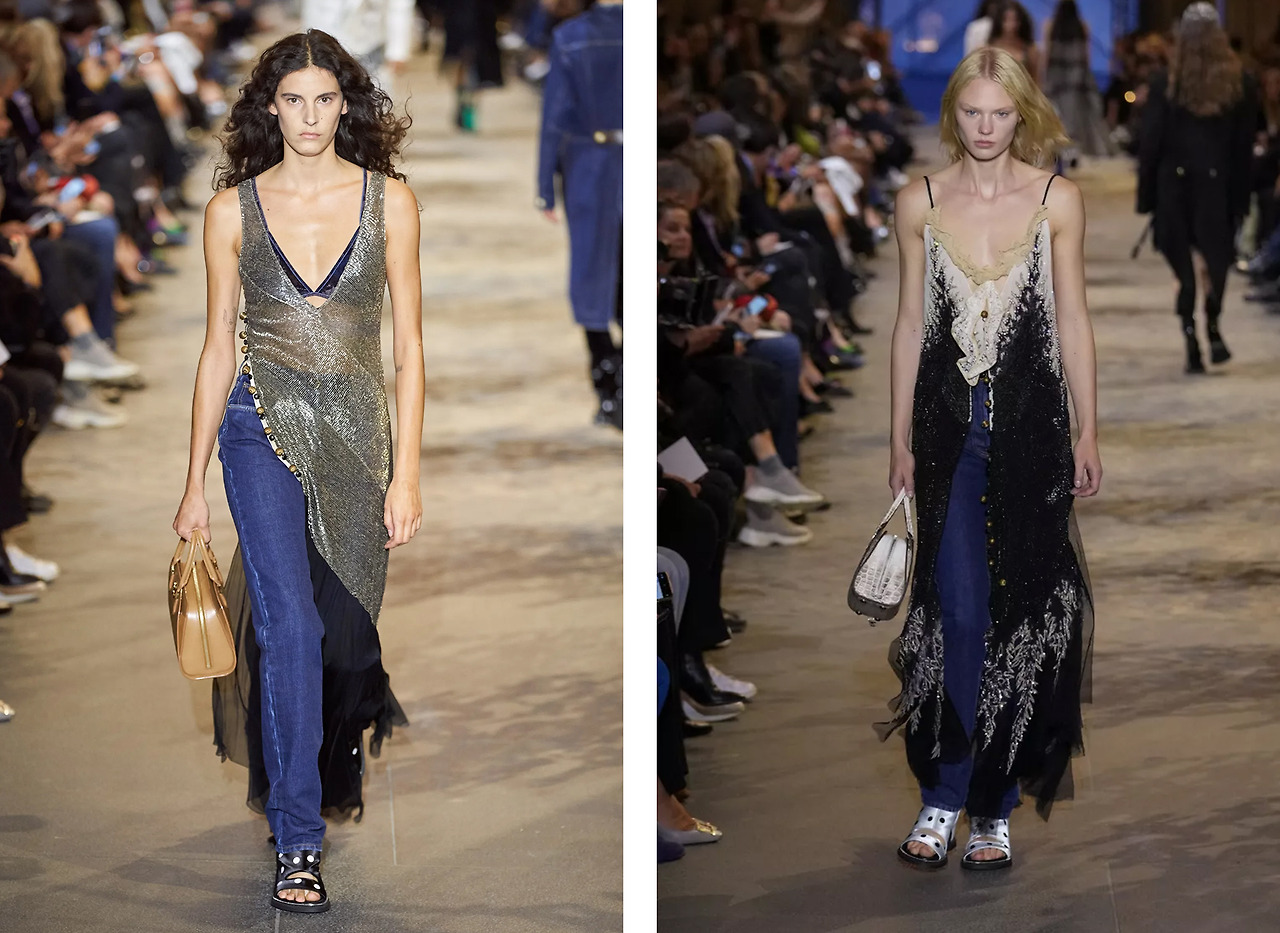 애슐리 티스테일의 하의 레이어링 변주는 다채로움 그 자체다. 무릎까지 내려오는 언발란스 슬리브리스 원피스를 진과 매치하는 과감함, MIU MIU 로우라이즈 스커트를 연상케 하는 미니스커트와 7부 기장의 슬랙스, 쨍한 민트 컬러의 슬립과 디스트로이드 진까지. 그저 Y2K 패션이라고 정의하기엔 명쾌한 느낌이 들지 않을 정도로 어나더 레벨 패션을 남긴 애슐리 티스테일.