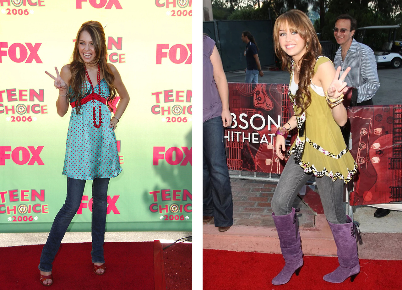 하이틴 영화 한나 몬타나(Hannah Montana)로 국민 여동생 수식어를 차지한 마일리 사일러스(Miley Cyrus). 지금의 반항적 이미지와는 달리 틴 팝스타답게 귀엽고 사랑스러운 이미지가 돋보였던 유년 시절 마일리도 레이어드 패션을 즐겼다. 애슐리 티스테일처럼 길게 내려오는 스커트는 아니지만 데님과 슬리브리스 탑을 함께 매치해 영락없이 향수를 불러일으키는 레트로 패션을 확인할 수 있다.