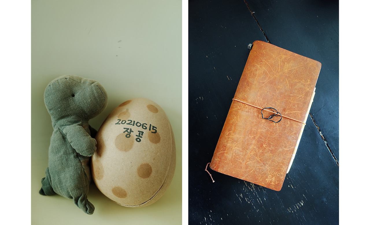 제겐 세상에서 제일 귀여운 존재인 공룡 인형과 미도리 트래블러스 노트입니다. 공룡 인형은 쇼핑하다 우연히 마주쳤는데 너무 귀여워서… 바로 데리고 왔습니다. 미도리 노트는 책이나 영화를 보면 꼭 적어두고 싶은 문장이나 대사들이 생기는데, 그걸 모아두는 창고 같은 곳입니다.