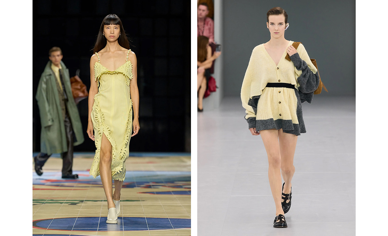 이 무채색들의 싸움 안에서 묵묵히 자신의 존재감을 드러낸 컬러가 있으니, 바로 먹음직스러운 버터빛이다. 옐로의 천진난만함에 화이트 한 방울만 투하하면 부드럽고 섬세한 분위기의 여성으로 변신할 수 있다니! 여기 BOTTEGA VENETA와 LOEWE, Proenza Schouler의 버터 컬러 드레스를 보면 바로 납득이 될 것이다.