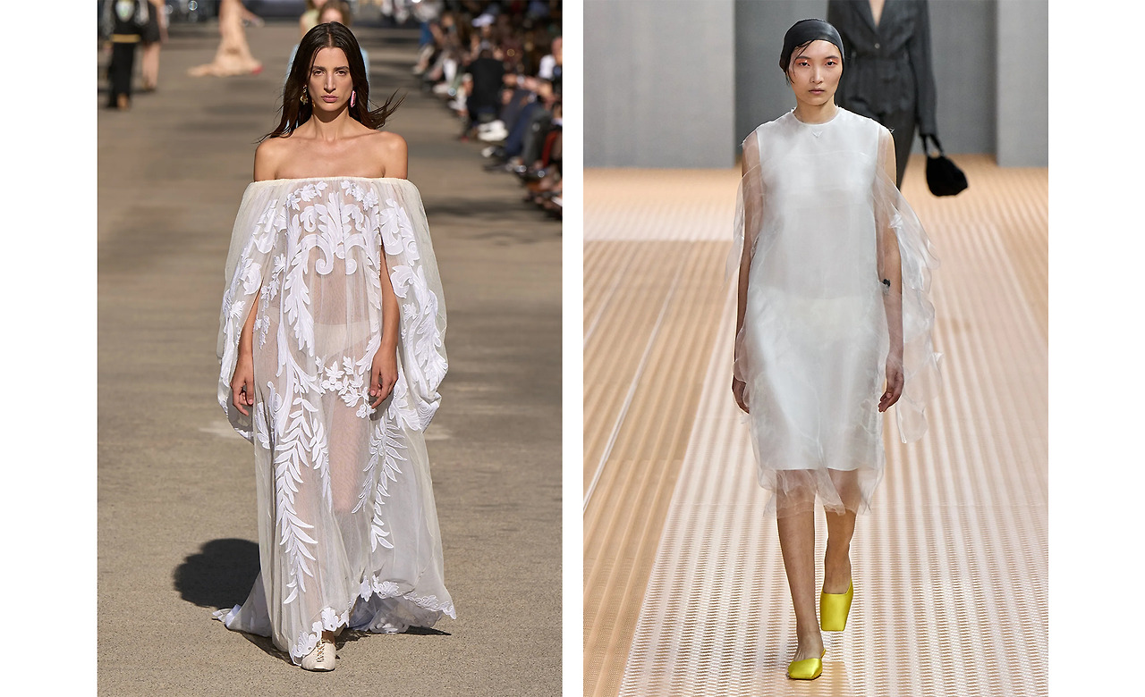 이젠 하나의 장르로 굳어진 화이트. 어떤 소재와 디자인에도 굴하지 않는 순수미의 결정체다. 이번에도 각종 브랜드의 메인 의상을 독차지하며 SS의 단골 컬러임을 다시 한 번 증명했는데, 주로 메쉬와 시폰, 레이스와 같은 시스루 원단을 만나 화이트만의 시원하고 경쾌한 느낌을 살린 모습이다. 대신 헤어와 액세서리는 최대한 덜어내 순백이 가진 고유의 말끔한 분위기를 유지해냈다.