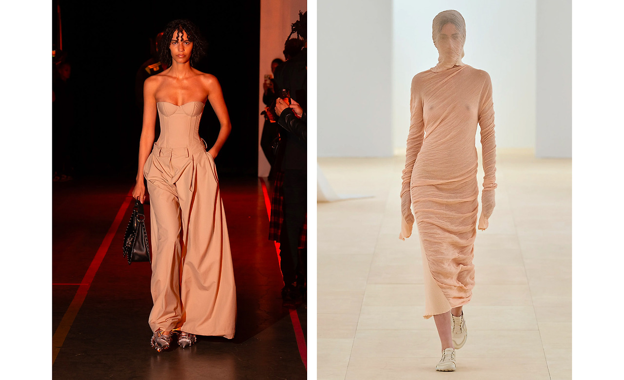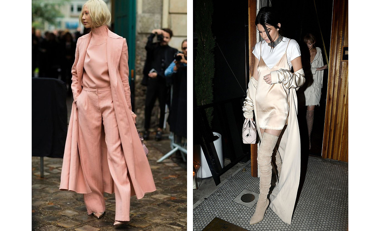 머리부터 발끝까지 은은한 피치 퍼즈 색을 입으면 특유의 우아한 분위기를 보여줄 수 있다. 누드 컬러의 하이힐을 신은 ALAÏA의 룩 통해 다리 비율이 길어 보이는 힌트를 얻을 수 있을 것.