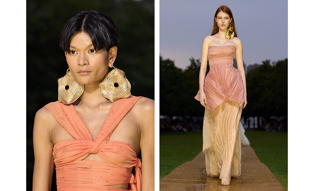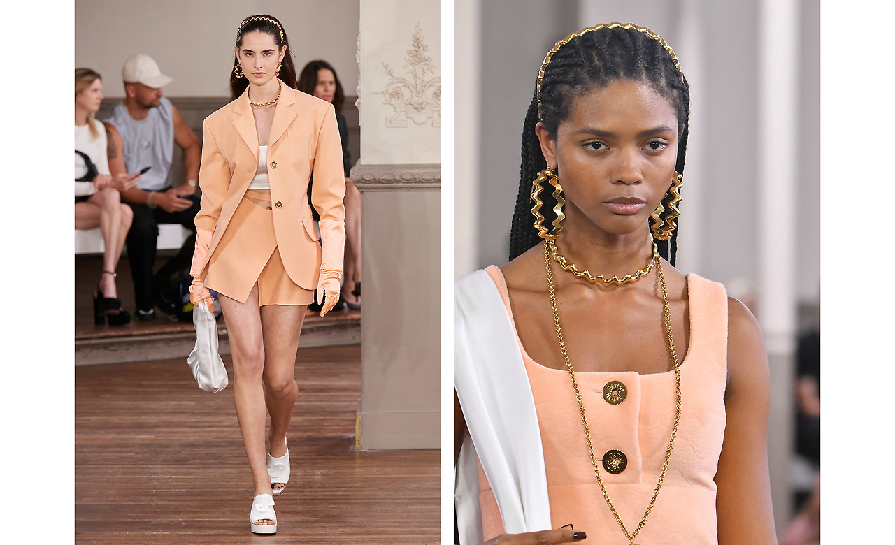 웜톤 계열의 색상인 만큼 골드 계열의 악세서리와도 찰떡궁합. 볼드한 골드가 피치 퍼즈와 만났을 때 자연스럽게 룩에 녹아드는 것을 확인할 수 있을 것.