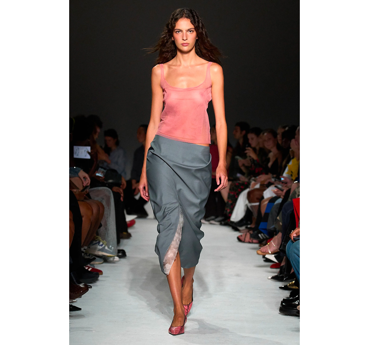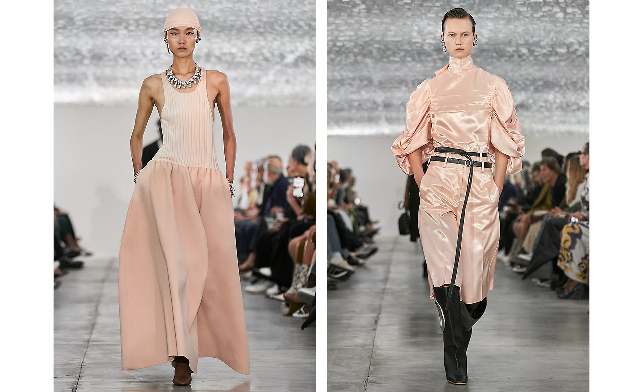 발레에서 영감 받은 듯한 JIL SANDER 2024 SS. 은은하게 스며드는 피치 퍼즈 컬러로 미니멀하지만 확실한 인상을 남겼다.