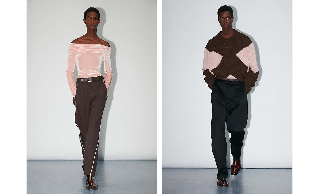 남자라면 핑크. 같은 계열인 피치 퍼즈도 예외는 아니다. 옷 좀 입는 남자라면 올해는 피치 퍼즈와 친해질 마음의 준비를 하자. Kiko Kostadinov가 부드러운 피치 컬러가 더 이상 여성들만을 위한 색이 아님을 증명해 보였으니. 슈트보다는 좀 더 편하게 입을 수 있는 아이템들 위주였다. 롱 드레스, 탑 제품 그리고 피치 퍼즈 디테일로 포인트를 준 팬츠까지