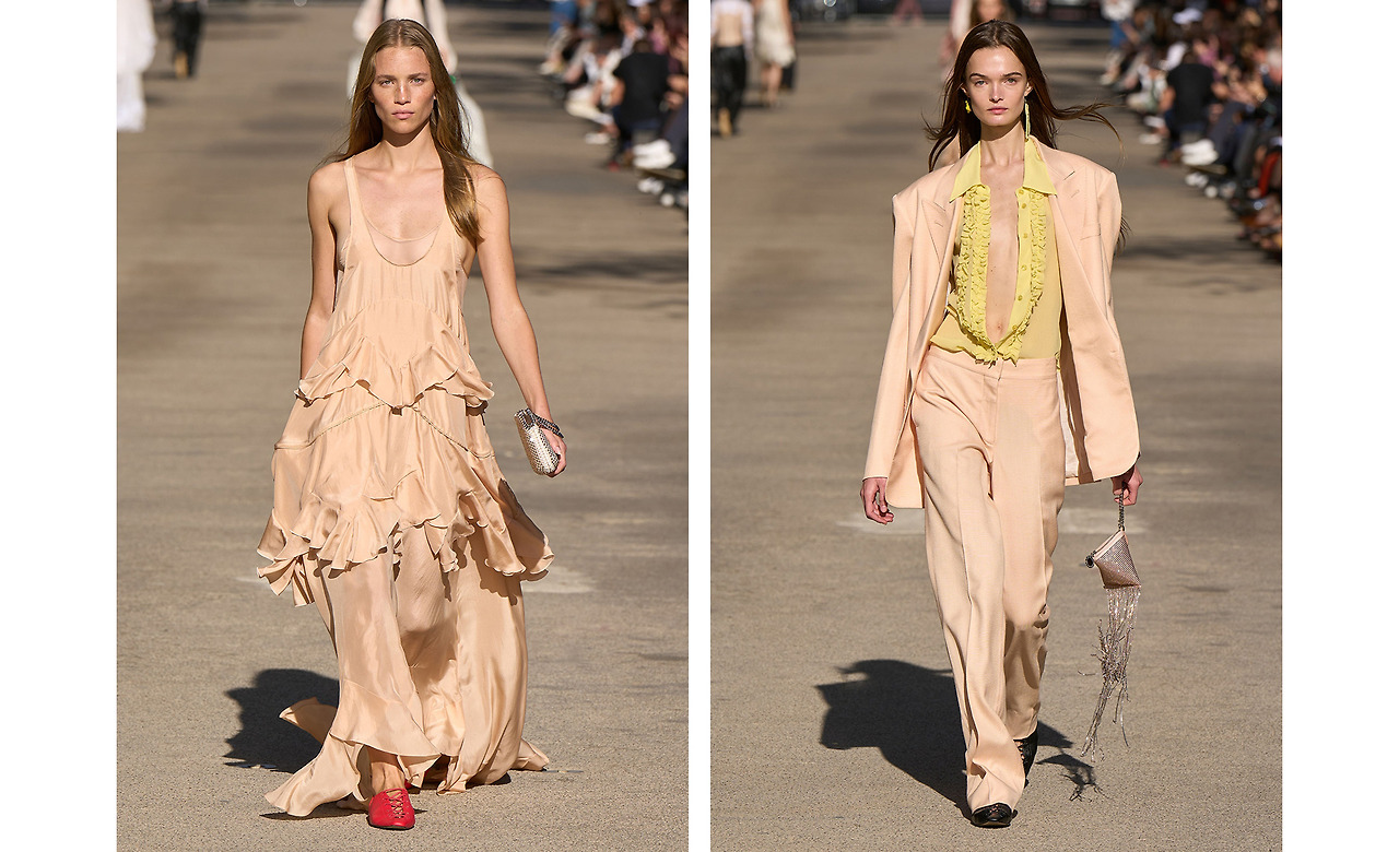 빈티지한 매력과 현대적인 우아함 사이에서 미묘한 균형을 이루는 피치 퍼즈. Stella McCartney의 드레스와 자켓은 시적이면서도 로맨틱한 분위기를 자아낸다.