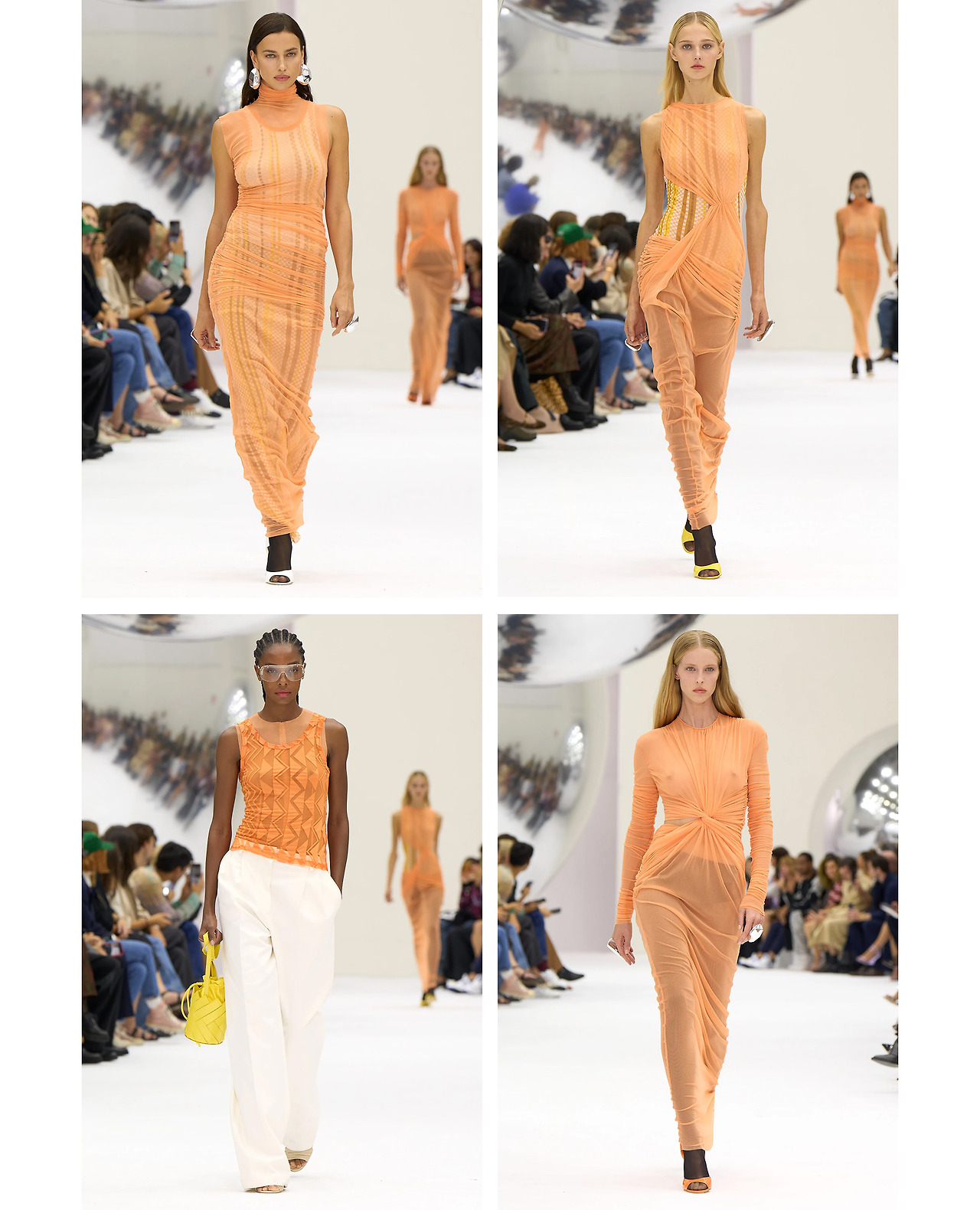 그야말로 피치 퍼즈의 향연이었던 Missoni. 팬톤 관계자가 올해의 컬러 발표 전 디자이너에 귀뜸을 해줬나 싶을 정도다. 핑크와 오렌지 사이에 편안하게 자리 잡은 피치 컬러가 몸을 타고 흐르는 실루엣 드레스가 만나 향수를 불러일으키며 룩에 임팩트 있는 경쾌함을 불어넣는다.