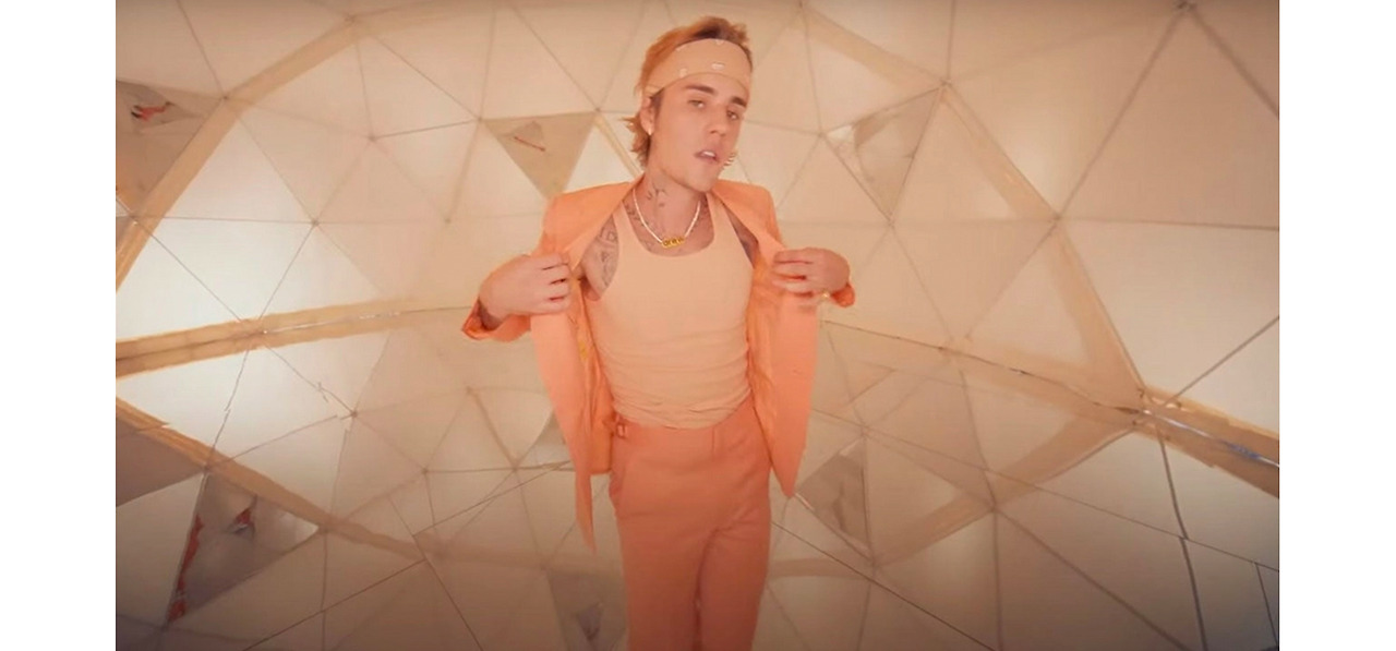 여기서 ‘Peaches’는 과일 복숭아가 아니라 아내 헤일리 비버(Hailey Bieber)를 향한 애칭이다. 사랑하는 아내에게 마음을 고백하는 가사답게 머리부터 발끝까지 사랑스러운 피치 셋업으로 무장한 모습. 보아라, 사랑을 고백하는 남자라면 과연 피치 퍼즈다.