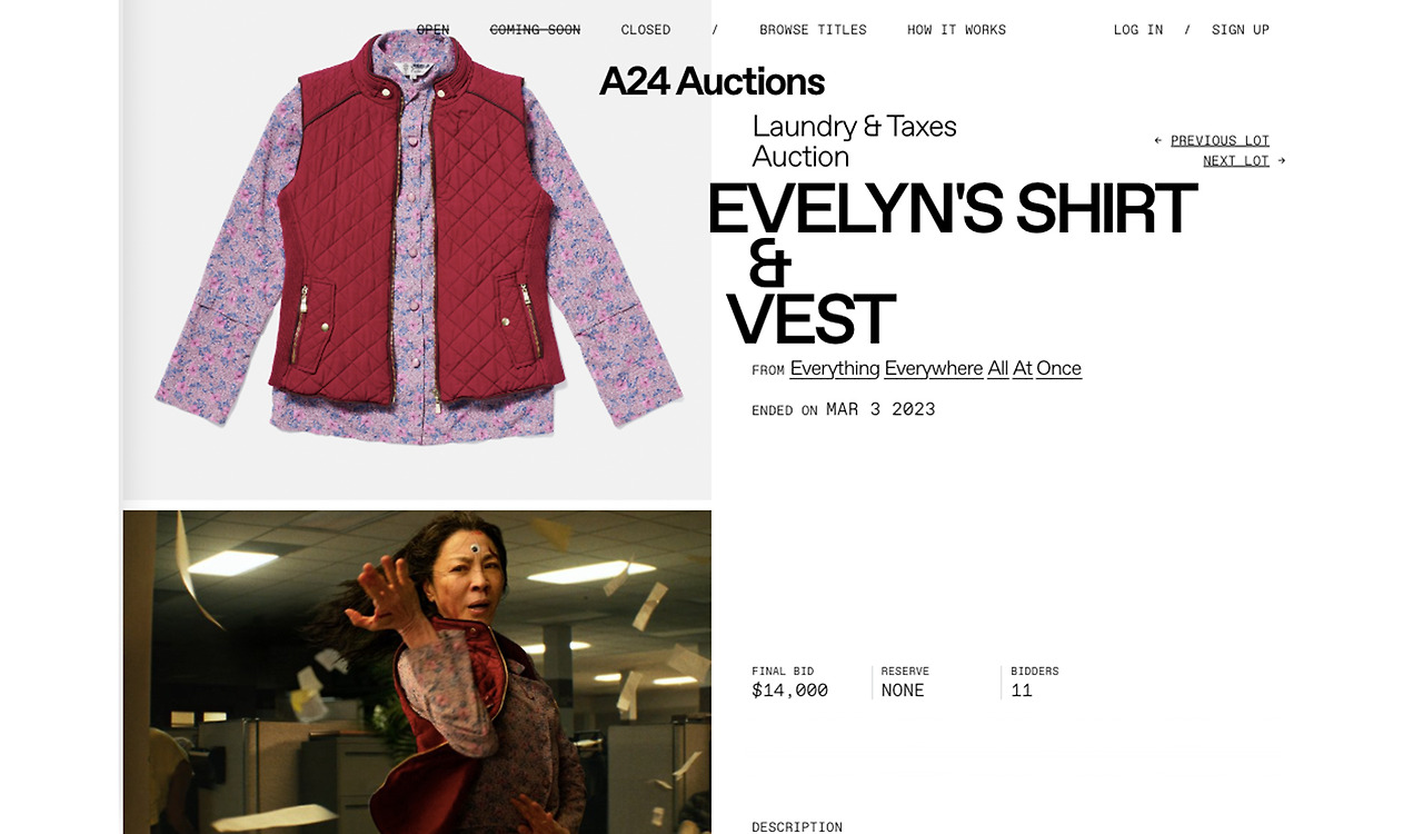 한편, A24는 웹 사이트를 통해 에블린의 셔츠&베스트, 핫도그 핸드, 조부 투파키 의상 등으로 의상 경매를 진행하기도 했다. 물론 지금은 아쉽게도 품절이다. 모든 수익금은 영화 속에 에블린이 세탁소에서 일한 것에서 착안해 세탁노동자센터, 아시아인들을 위한 정신건강협회, 트렌스젠더 법률 센터 등에 기부했다고. 그러니 앞으로 좋아하는 A24 작품이 있다면 ‘A24 Auctions’를 잊지 말고 방문하자.