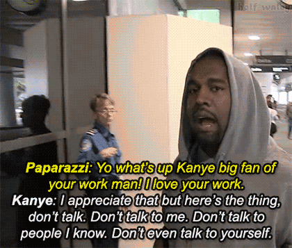 한 파파라치가 칸예에게 팬이라며 인사를 건네자, 그는 “고맙지만 나한테 말 걸지 마. 내 지인들한테도 말 걸지 말고 너 자신한테도 말 걸지 말라고”라며 아주 단단히 분노한 모습을 보이기도 했다. 자신의 노래 가사에서도 파파라치를 두고 나치보다 싫다며 강한 적대감을 드러낸 칸예지만, 기분이 좋을 때는 파파라치에게 자신을 어떻게 찍을지 자세히 디렉션(!)을 주기도 하고, 파파라치와의 오붓한 드라이브를 하기도 하는 모습은 그의 종잡을 수 없는 캐릭터성을 보여 주는 한 예이기도 하다.