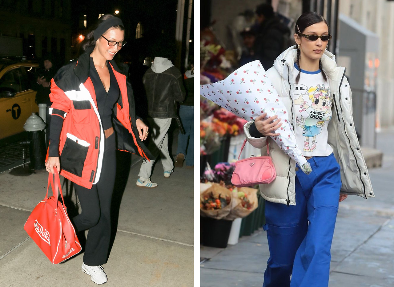 Y2K 트렌드의 선구자답게 한때 유행했던 Von Dutch의 스포티한 레드백이나 귀여운 핑크빛 빈티지 PRADA 백을 스타일링 적재적소에 활용한 모습.