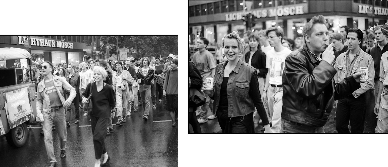 영국에서 레이브파티가 지속되는 한편, 1989년 베를린 장벽이 무너지기 4달 전에 독일의 테크노 DJ인 닥터 모트(Dr. Motte)는 서베를린에서 자신의 생일을 기념하며 ‘평화, 기쁨, 팬케이크(Friede, Freude, Eierkuchen)’라는 슬로건으로 일종의 레이브파티인 ‘테크노 퍼레이드’를 기획하게 된다.
